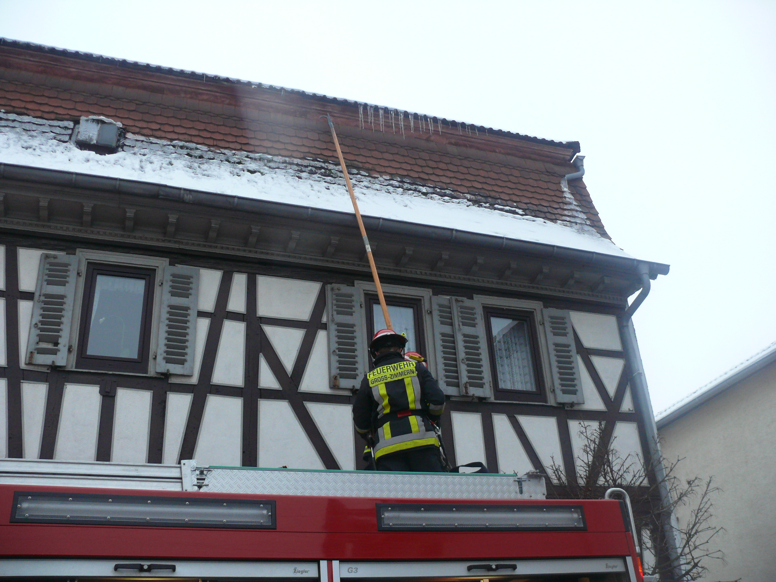 Da diese Dachkante nur rund 6 Meter hoch war konnte man die Eiszapfen, stehend auf dem begehbaren Dach des Löschfahzeugs, mittels Einreißhaken entfernen. Um eine Gefährdung von Fußgängern auszuschliessen wurde der Einsatzbereich für die Dauer der Arbeiten abgesperrt.