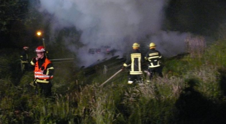 Bereits auf der Anfahrt zum Brandort liess der Einsatzleiter per stillem Alarm Vollalarm auslösen. Mit 4 C- und einem B-Rohr rückten die Einsatzkräfte dem Feuer zu Leibe und konnten die meterhoch in den Nachthimmel schlagenden Flammen rasch löschen. Nach intensiver Glutnestsuche und Nachlöscharbeiten wurde der Palettenstapel auseinander gezogen und abschliessend noch einmal bewässert. Nachdem gegen 05:15 Uhr die Fahrzeuge und Gerätschaften in den Gerätehäusern wieder Einsatzbereit gemacht wurden, konnten auch die Einsatzkräfte wieder zu Bett gehen.