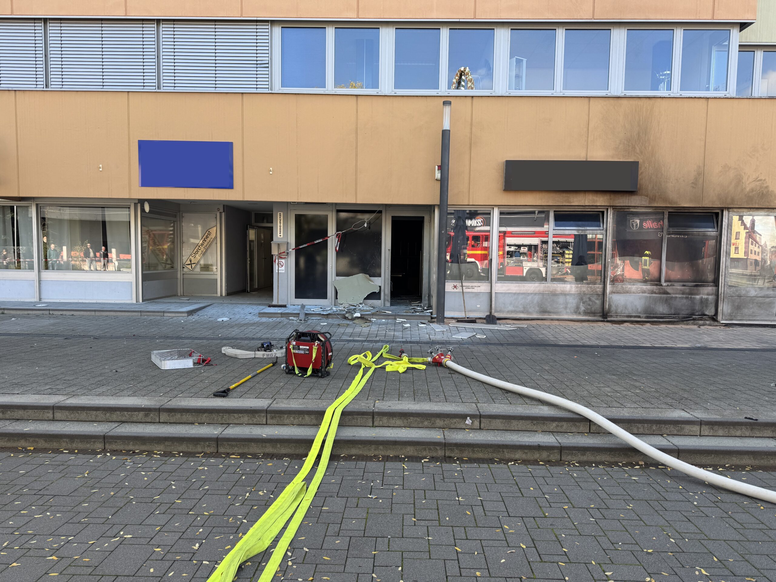 Bei Eintreffen der ersten Kräfte war das Feuer, welches sich vor Allem an der Fassade des Gebäudes befunden hatte, durch Passaten mit einem Feuerlöscher weitgehend gelöscht worden. Die Feuerwehr räumte den Gebäudekomplex, welcher mehrere Arztpraxen sowie eine Bar beherbergt, auch wegen der starken Rauchentwicklung. Im Anschluss wurden alle Geschäftsräume mittels Wärmebildkamera auf mögliche Brandbeeinflussungen hin kontrolliert und das Gebäude belüftet.