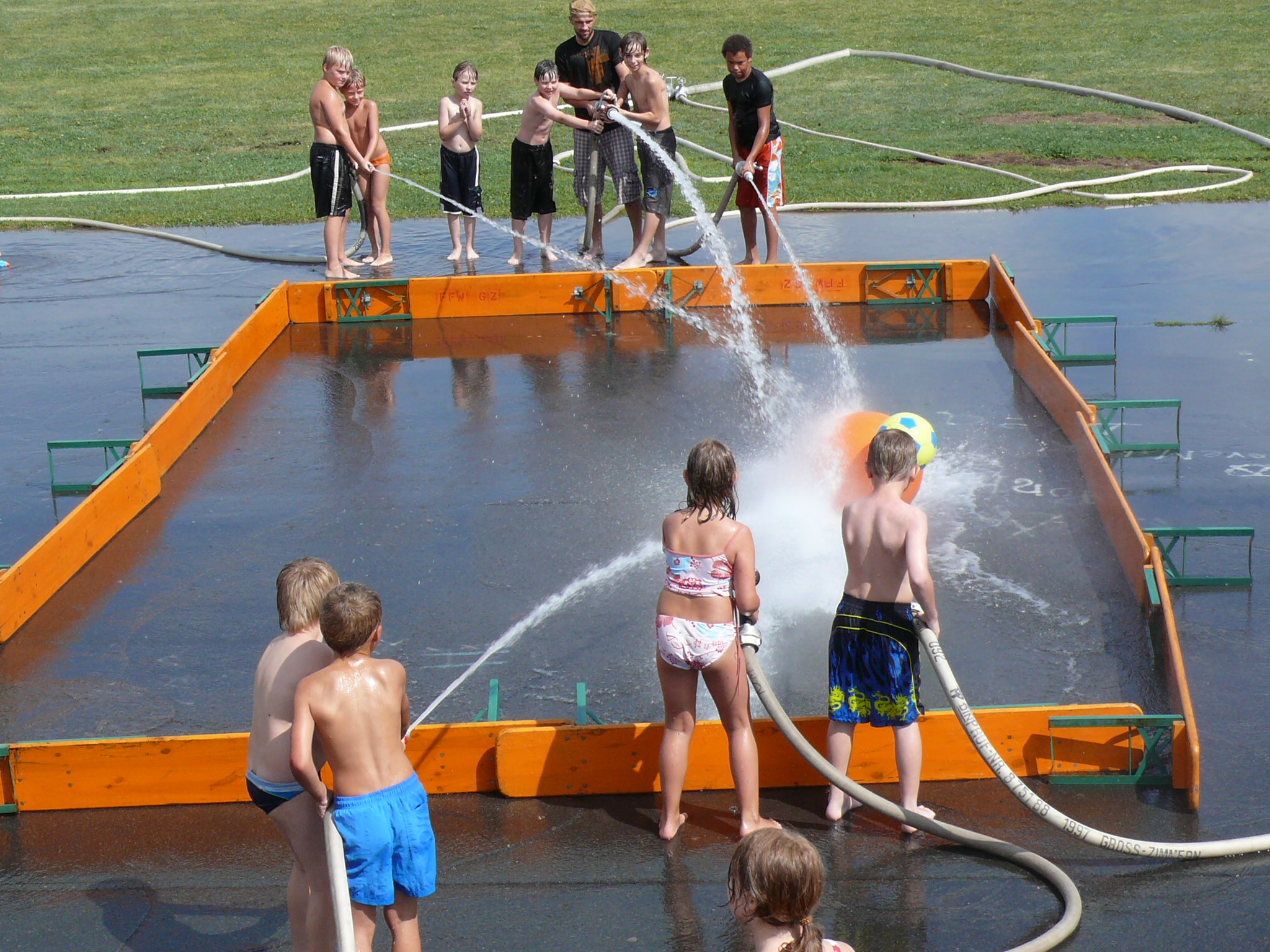 Als diese Zeremonie vollbracht war konnten sich die Kinder, mit C-Strahlrohr und ganz viel Wasser bewaffnet, bei einem Wasserfußballspiel austoben. Hierbei stehen sich 2 Mannschaften jeweils mit 3 C-Rohren ausgerüstet gegenüber und müssen mit Wasserkraft den Ball an die gegnerische Bande befördern.
