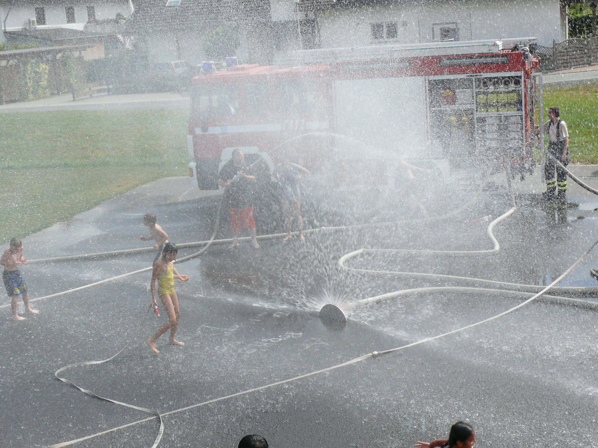 Aber der Höhepunkt sollte noch kommen. In Windeseile bauten Betreuer und Feuerwehrleute das zuvor genutzte Spielfeld ab und rüsteten mit weiteren Rohren und Hydroschilden zum großen Finale – der aufgeregt erwarteten Wasserschlacht. Durch Wasserwände und die Sprühstrahlen der Rohre wurde nun auch der letzte noch trockengebliebene nass und wurde vom Spaßvirus infiziert.