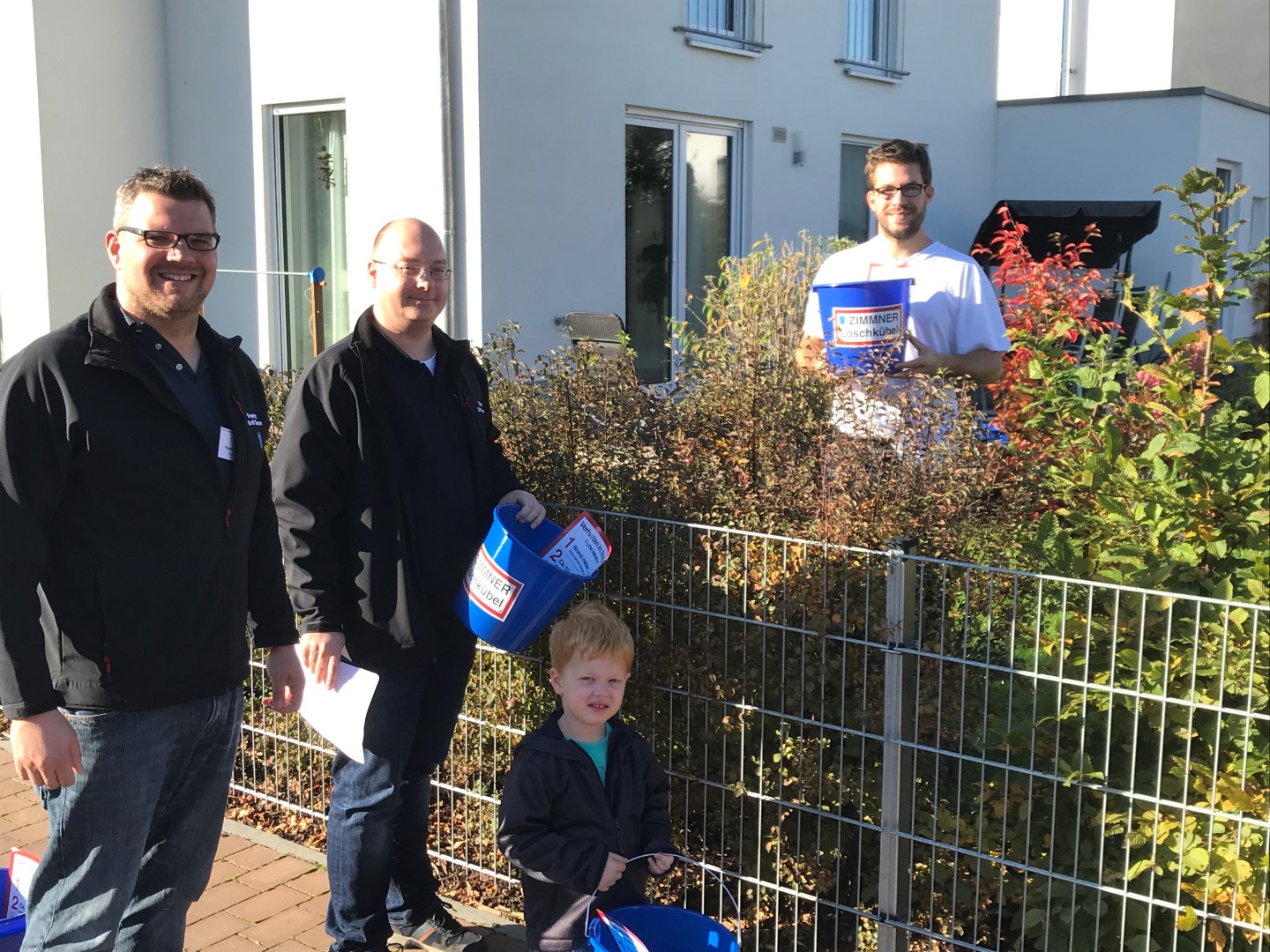 Nicht so am Samstag, denn da besuchten die ehrenamtlichen Feuerwehrleute zusammen mit Bürgermeister Achim Grimm die Neubaugebiete, um über die Arbeit der Freiwilligen zu informieren. Im Rahmen der Löschkübel-Aktion kam man so mit Bewohnern an der Alten Ziegelei, dem Schlädchen sowie dem Roten Morgen ins Gespräch. Das die spaßig aufgezogene Löschkübel-Aktion dennoch einen ersten Hintergrund hat, erklärten die Feuerwehrleute den interessierten Bürgern gern. "Wenn tagsüber nur 5 der 45 aktiven Einsatzkräfte kommen können, weil die anderen außerhalb arbeiten, kann das je nach Lage schon mal eng werden" beschreibt Wehrführer Marcel Goeden die aktuelle Situation. Grundsätzlich ist die Feuerwehr technisch gut aufgestellt und der Ausbildungsstand ist auf einem hohen Niveau – nur personell wird besonders tagsüber Verstärkung benötigt. Daher sucht die Feuerwehr Menschen, die das Team der freiwilligen Retter verstärken wollen und lädt am Mittwoch, 25. Oktober um 19:00 Uhr zu einer Infoveranstaltung ins Feuerwehrhaus ein. Weitere Infos unter http://loeschkuebel.feuerwehr-zimmern.de