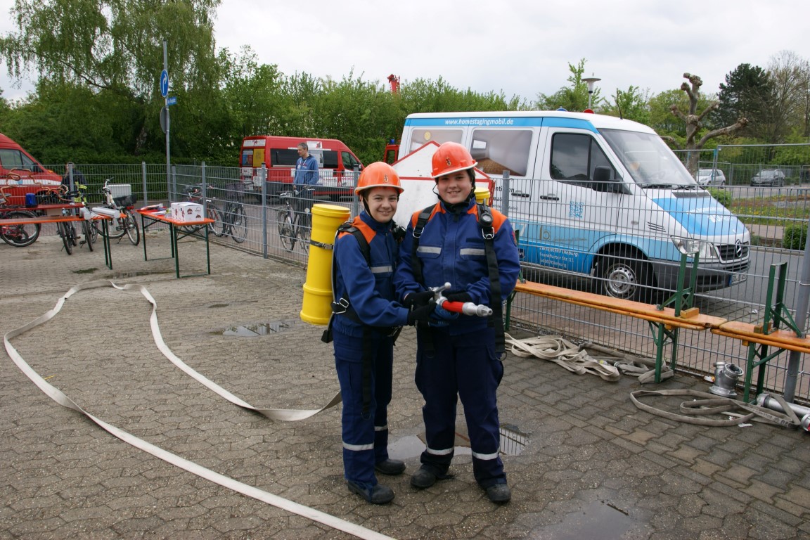 Am 30. April fanden viele zumeist junge Leute den Weg ins Feuerwehhaus. Die aufwändig eingerichtete Hütchenbar war brechend voll und die freiwlligen Helfer hinter der Theke hatten alle Hände voll zu tun. Auch im Indoor-Biergarten ließen es ich sich zahlreichen Besucher bei heißen Würstchen und Steaks vom Holzkohlegrill und kalten Gertränken gut gehen. Das Traditionelle Fest am 1. Mai war trotz mäßigen Wetters gut besucht. Bei kühlen Temperaturen fanden viele Menschen den Weg ins Feuerwehrhaus, wo Sie in der geschützten Fahrzeughalle aber auch auf dem hergerichteten Hof feierten. Besonderes Highlight waren auch in diesem Jahr wieder die Aktivitäten der Jugendfeuerwehr. Mit viel Hingabe und Begeisterung sorgten die 10-17jährigen Nachwuchsfeuerwehrleute für abwechlungsreiche Beschäftigung bei den jungen Festbesuchern. Krönung war die Schauübung der Jugendfeuerwehr – hier galt es ein fiktives Feuer in einer Garage zu löschen.