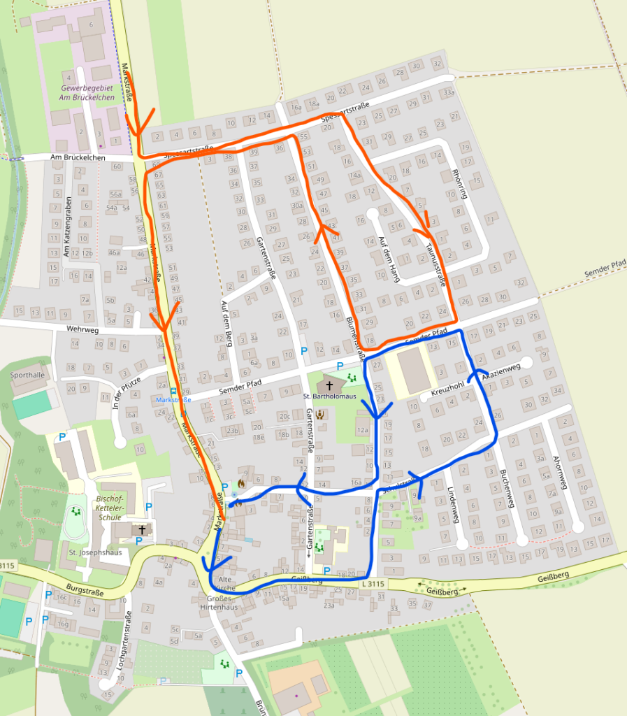 Blau: Start Feuerwehrhaus, Geißberg bis Blumenstraße, Blumenstraße bis Schulstraße, Schulstraße bis Taunusstraße, Taunusstraße bis Semder Pfad, Semder Pfad bis Blumenstraße, Blumenstraße bis Schulstraße, über die Schulstraße zum Feuerwehrhaus.