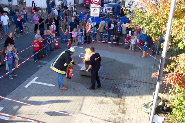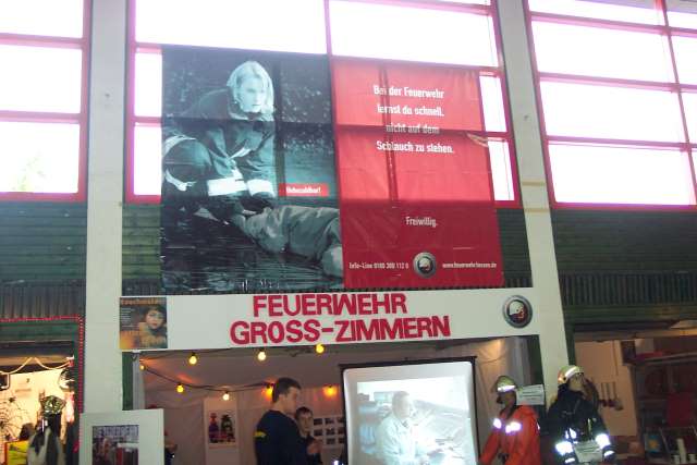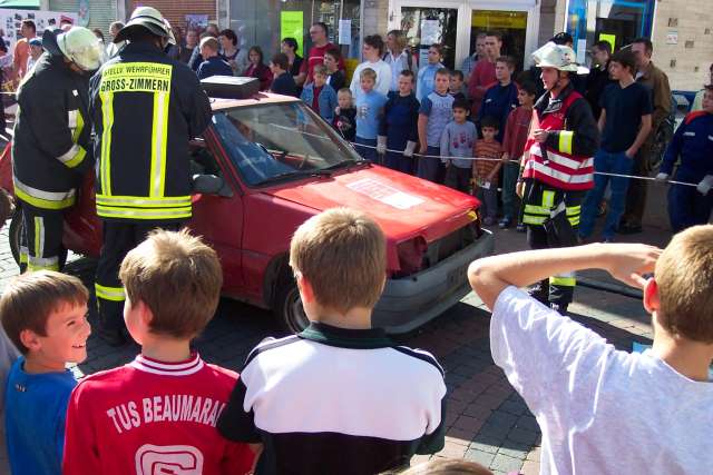 Gleich zwei Anlaufpunkte hatten die Kameraden der Groß-Zimmerner Einsatzabteilung vorbereitet: „Feuerwehr zum Anfassen“ vor dem Rathausplatz sowie eine Vorstellung der einzelnen Abteilungen in der Mehrzweckhalle. Für die Hilfe bei den umfangreichen Vorbereitungen sei allen Helfern der Groß-Zimmerner Einsatzabteilung an dieser Stelle ein Dank ausgesprochen. In der Mehrzweckhalle Die verschiedenen Abteilungen der Groß-Zimmerner Feuerwehr wurde in der Mehrzweckhalle durch die Kameraden Klaus und Jessica Wehmuth sowie Hannes Eckhardt präsentiert. Mit Fotos, Gegenständen zum Anfassen und umfangreichen schriftlichen Infomaterialien wurden Feuerwehrverein, Jugendfeuerwehr sowie Einsatzabteilung vorgestellt. Der durch die Feuerwehrleute selbst gedrehte Film „Brennt PKW!“ zeigte den beeindruckten Besuchern die Abläufe während eines Feuerwehreinsatzes. Wahlweise eine kostenlose DVD oder einen Rauchmelder zum Nulltarif gab´s für neue Mitglieder im Feuerwehrverein. Bei einem Gewinnspiel galt es das Gewicht der persönlichen Schutzausrüstung eines Feuerwehrangehörigen zu schätzen. Der Gewinner konnten sich über ein kleines Präsent freuen. Vor dem Rathausplatz Vor dem Rathausplatz war Action angesagt. Am Samstag nicht jedoch für die Feuerwehrangehörigen sondern für die Besucher des Kürbismarktes. Ein Feuerlöschtrainer bot die einmalige Gelegenheit, den Umgang mit dem Feuerlöscher zu üben. Auch ein hydraulisches Schneidgerät konnten die Besucher ausprobieren. Auch Bürgermeister Dieter Emig sowie Bürgermeisterkandidat Achim Grimm bewältigten die Aufgaben unter fachkundiger Anleitung der Feuerwehrmänner Constantin Kunze und Tobias Keller mit Bravur. Das Thema „Vorbeugender Brandschutz“ brachten die Kameraden Marcus Paschke und Daniel Wehmuth „dem Bürger“ näher. In ausführlichen Beratungen zu Rauchmeldern sensibilisierten sie die Besucher für die Anschaffung der kleinen Lebensretter. Marcus Paschke führte für kleine Gruppen einen Brandschutzunterricht durch. Vorführung am Sonntag „Hilfe ich bin eingeklemmt“ – lautete das Thema einer Schauübung die am Sonntag um 13:30 Uhr unter der Leitung von Brandmeister Markus Bieker gezeigt wurde. Während die Abläufe Schritt für Schritt erklärt wurden zerlegte eine Gruppe einen verunfallten Kleinwagen vor vielen interessierten Zuschauern. Spiel & Spaß für die „Kleinen“ Am Sonntag Nachmittag wurden unter der Leitung von Mark Czerny und der Klein-Zimmerner Jugendfeuerwehr lustige Wasserspiele für die kleinen Kürbismarktbesucher angeboten. An einer Spritzwand tobten sich die zahlreichen Teilnehmer aus. Unterstützt wurde die Aktion von Mitgliedern der Groß-Zimmerner Jugendfeuerwehr Für die großzügige Spende von Stefan Blank (Vermittlungsbüro Blank) möchte sich die Feuerwehr an dieser Stelle besonders bedanken. Ebenfalls Dank gilt dem Kaufhaus Belmodi für die Überlassung zweier Schaufensterpuppen.