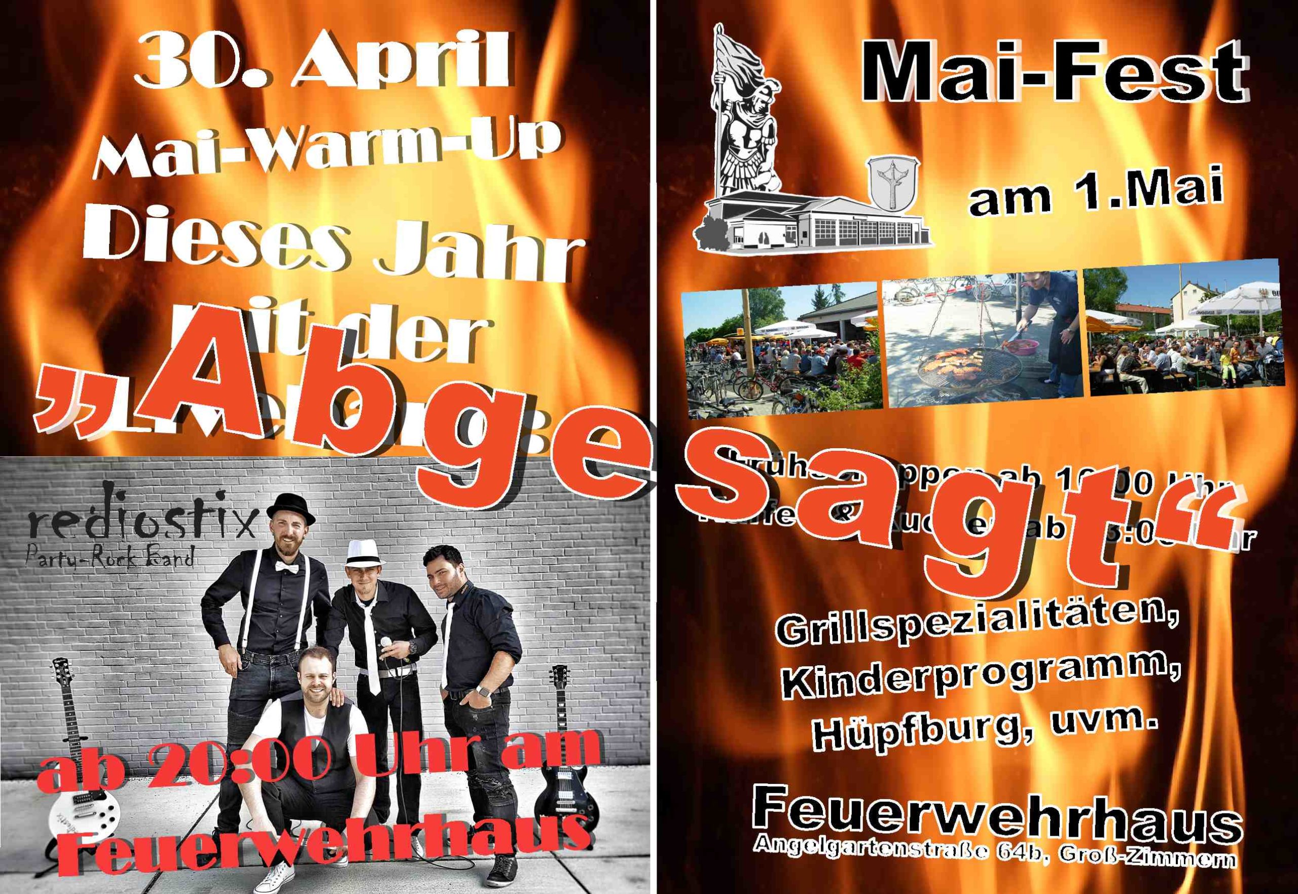 Nachdem die Wehrführung sich auf Anraten des Landkreises Darmstadt-Dieburg dafür entschieden hat zum Schutz der Einsatzkräfte den Übungsbetrieb einzustellen, sowie ein Betretungsverbot für das Feuerwehrhaus auszusprechen, hat der geschäftsführende Vorstand nachgezogen und auf Grund der Vorgaben des Landes Hessen die vereinseigene Gaststätte ab dem 18. März 2020 bis auf Weiteres geschlossen. Alle Vorbereitungen für die Festtage am 30. April und 1. Mai 2020 waren getroffen, die Band war gebucht, das Material bestellt sowie die Dienstlisten ausgehängt. Die derzeitige Lage und die Tatsache, dass nicht absehbar ist, dass die gültigen Erlasse bis zu unserer Veranstaltung aufgehoben werden, müssen wir nach vielen Gesprächen und Beratungen weitere Maßnahmen zum Schutz der Einsatzkräfte, der Vereinsmitglieder sowie der Bevölkerung treffen und die Festlichkeiten absagen. Wir bedanken uns bei allen Mitgliedern, die bis jetzt versucht haben an der Durchführung unseres Fests festzuhalten und an den Planungen, Vorbereitungen und Werbemaßnahmen unterstützt haben. Ein besonderer Dank geht auch an die Band Rediostix, welche unserem neu gestalteten Mai-Warmup den musikalischen Rahmen verpassen wollten. Die Einsatzabteilung der Feuerwehr Groß-Zimmern ist natürlich weiter für Sie im Einsatz!